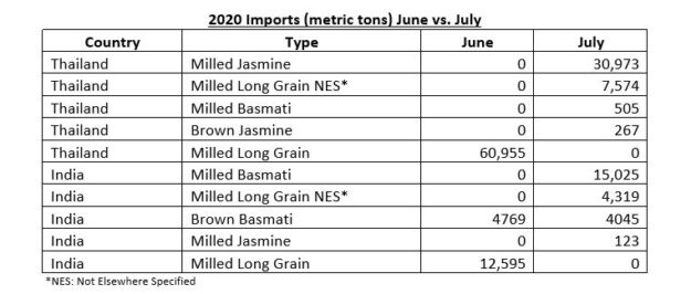 经过美国稻米成功的请愿后,7月1日,美国国际贸易委员会(ITC)对精制茉莉香米、糙茉莉香米、精制印度香米实施了新的统一关税表代码。本月,第一批使用新关税代码的7月稻米进出口数据公布。