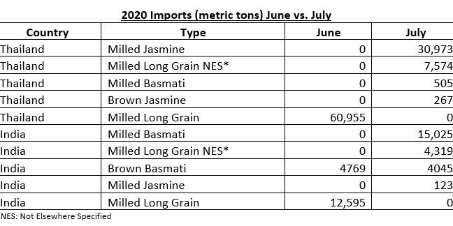 经过美国稻米成功的请愿后,7月1日,美国国际贸易委员会(ITC)对精制茉莉香米、糙茉莉香米、精制印度香米实施了新的统一关税表代码。本月,第一批使用新关税代码的7月稻米进出口数据公布。